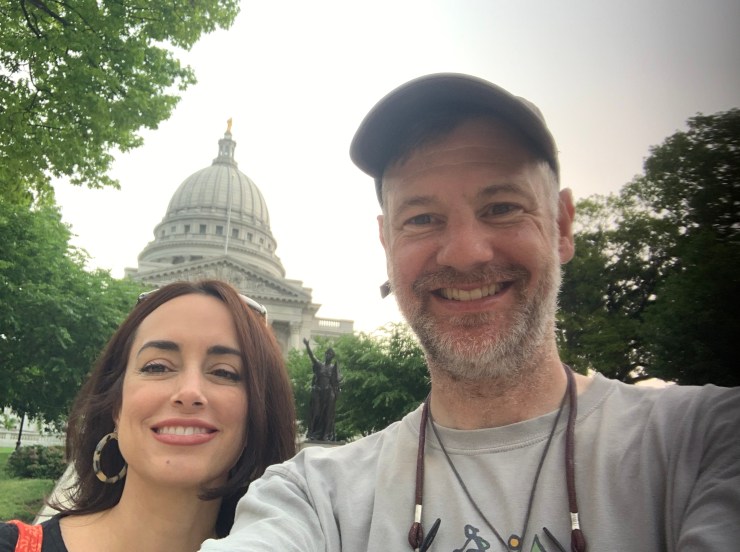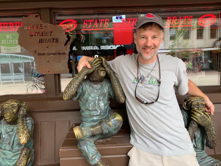 One of the coolest experiences I have had along the route was reconnecting with my favorite Wisconsiner (Wisconsonian?), my dear friend Nina. We used to work together and I really have missed having her around. I got yet another insider tour from her.I was wondering if it was a permanent sign. Scott Walker strikes again!Nina took me to an iconic Madison Restaurant to dine with her sister, Katy, where I sampled typical fair including the namesake old-fashioned, which is made differently in Wisconsin that another places. I also felt obliged to have the cheese curds (pull my arm….so yummy) And more brats. Have you noticed how well I’ve eaten on this tour?It’s another great thing about Bike touring, you really don’t have to worry about the calories too much because I will burn them in the 360 miles left.
